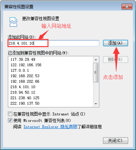 使用IE浏览器(或者360浏览器),IE浏览器在“设置”里,点击“兼容性视图设置”,弹出“兼容性视图设置”对话框,在添加此网站文本框输入“121.229.44.221”,点击“添加”按钮。